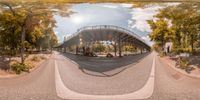A fish-eye view of a bridge in Berlin, Germany. Cars drive underneath the bridge, with the city's architecture and autumn foliage in the background. The sunlight casts a warm glow on the road and creates long shadows. A picturesque scene of urban life in Europe.