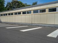 a metal building with a corrugated door in front of it and trees lining the street behind it