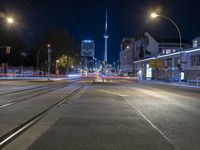 A night scene in Berlin, Germany. The modern architecture of the city stands out against the dark sky. Light streaks and motion blur depict the vibrant city life and the heart of the metropolitan area.