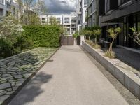 A straight view down the road in Berlin, Germany. The asphalt glistens under the clear sky, surrounded by modern residential architecture. Capturing the essence of city life in Europe.