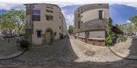 A panoramic view of a cobblestone street in Berlin, Germany. The street is lined with charming houses and people can be seen walking along. Classic architecture and a mix of urban design create a unique city atmosphere.