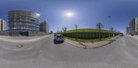 A view of urban architecture in Bremen, Germany. Modern buildings with brick facades line the residential area. Clear sky and sunny day enhance the vibrant city life. A symmetrical composition captures the essence of urban design in Europe.