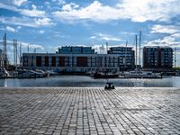 This is an image of a modern residential area in Bremen, Germany. The photo captures the city's unique architecture and urban design, with buildings and roads reflecting a clear sky and the early morning light. In the foreground, a road surface leads to a pier and jetty on the lake, providing access to water resources and creating a public space. The cobblestone road and the boat at the pier add character to the scene. This photo represents the harmonious blend of modern architecture and natural surroundings in the city of Bremen.
