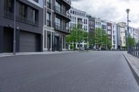 A modern and vibrant city road in Berlin, Germany. The road is lined with residential apartments and bustling with people walking and riding. The cloudy sky adds to the urban charm of this European city.