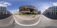 A modern architectural marvel in Berlin, Germany. This circular building stands tall amidst the cityscape, surrounded by other impressive structures. The vibrant yellow facade adds a touch of color to the urban design.