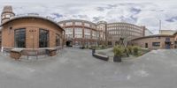 a view from the camera looking at buildings and a sky background behind it in the middle of a wide panoramic photo