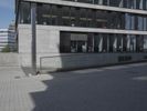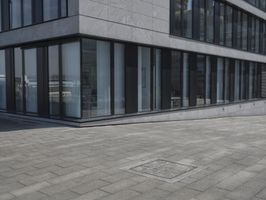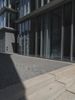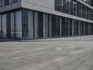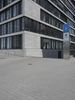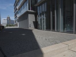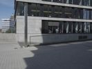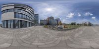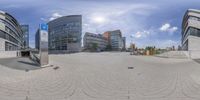 Duesseldorf, Germany: A modern cityscape with a clear sky. The fisheye lens captures the architecture of a corporate headquarters, showcasing the vibrant urban landscape. The building stands tall, reflecting the open spaces and walkways of the metropolitan area.