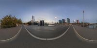 Skateboarder on a curved ramp in Berlin, Germany. Modern architecture and high-rise buildings create a striking cityscape. The bridge adds to the urban design. A clear sky illuminates the street with street lights.