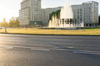 a traffic light is on and there is a large building with many windows and fountains