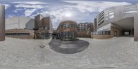 A large circular building with a classic architectural design stands near the road curb. The clear sky casts a hard shadow, enhancing the building's symmetry. This urban design gem is located in Germany.