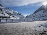 A stunning winter landscape in the highlands of Germany. The snow-covered mountains and clear sky create a picturesque scene. A road winds through the mountains, leading to a mountain pass. The sunlight breaks through the clouds, illuminating the scene with a golden glow.