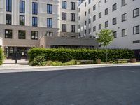 A modern residential high-rise building in Berlin, Germany. The architecture blends seamlessly with the urban design of the city. Cobblestone roads and lush green grass surround the building, creating a vibrant and lively atmosphere in this European city.