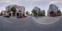 A snapshot of HafenCity in Hamburg, Germany, showcasing its modern architecture and urban design. The curved street with parked cars adds to the metropolitan vibe. The yellow facade of a residential building stands out against the concrete and asphalt. A unique blend of residential and commercial properties.