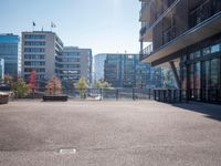 This is an image of modern architecture in Hamburg, Germany. The open space and clear sky create a beautiful day setting for the buildings. The shadows add depth and dimension to the scene. This photo represents the innovative and contemporary architecture found in Europe, specifically in Hamburg, Germany.