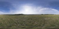 Vast Brandenburg landscape with open grassy spaces basking in German sunshine. Clear day with clouds adding texture to the greenery. The sun visible, illuminating the nature of Germany.
