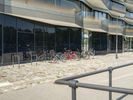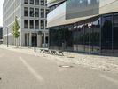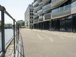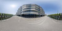 A modern residential building in Berlin, Germany. The unique architecture and design of the building stands out in the city's skyline. The clear sky and straight road highlight the urban design of the neighborhood.