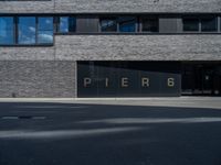 black glass window on a white brick building and street in front of it are letters that spell pier 6 and 4