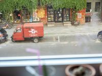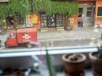 A snapshot of Berlin's bustling traffic. High-profile buildings tower over the busy streets, filled with vehicles of all types. Elevated roads and parking lots indicate a vibrant city. A typical day in Germany's capital.