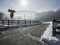 This is an image of a snowy road in the Alps, Germany. The mountain landscape is covered in frost and ice, creating a magical winter scene. In the foreground, there is a guard rail and an automobile parked by the side of the road. The clear sky and sunshine add a touch of warmth to the freezing temperatures. This photo captures the beauty of nature in rural Germany, with the majestic mountain range and tree-covered hills. It perfectly represents the serene and peaceful atmosphere of the European countryside.