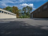 A straight road cutting through German suburbs. Modern office buildings and factories blend with residential areas. Clear European skies showcase the industrial and business district, symbolizing urban work life.