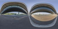 multiple curved windows reflecting the sun on the outside and into it, and some buildings in the background