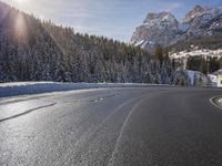 A picturesque winter landscape in the Alps of Germany. Snow-covered mountains and woody plants create a beautiful contrast against the clear blue sky. A winding road curves through the wilderness, leading to a suburban area with visible sun rays.