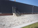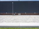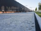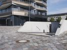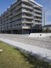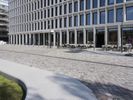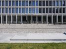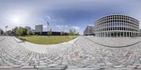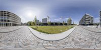 A modern office building in Berlin, Germany, with a sleek glass facade and a spacious lawn area. The clear sky and fish eye lens capture the architectural design. A perfect reflection of urban design in Europe.