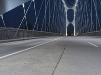 This is an image of a cable-stayed bridge in Frankfurt, Germany. The architecture of the bridge stands out against the clear sky, illuminated by artificial light at night. The road surface is made of asphalt and the lanes are marked with lines. The bridge is part of the city's infrastructure, connecting different parts of the urban area. In the background, the blue sky adds to the overall aesthetic of the scene. This photo captures the beauty of architecture and infrastructure in the city of Frankfurt at night.
