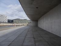 A view down the road in Berlin, Germany. Modern architecture and urban design fill the city skyline. The clear sky contrasts with the grey buildings and asphalt road surface.