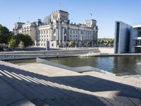 This is an image of a classic architecture plaza in Berlin, Germany. The open space is surrounded by concrete buildings, showcasing the modern architecture that the city is known for. The clear sky above contrasts with the hard shadows cast by the buildings. In the background, contrails from passing planes can be seen, adding to the urban atmosphere. This photo represents the blend of classic and modern architecture that defines Berlin's cityscape.