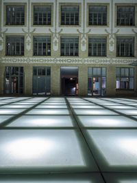 A view of a very large floor surrounded by buildings in Berlin, Germany. The architecture blends classic and modern elements. Neon lights illuminate the vibrant art and business districts at night.