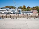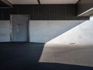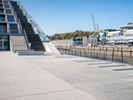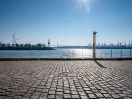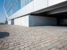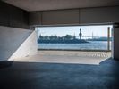 A modern architecture building near the water of a river in Hamburg, Germany. The clear sky and straight road create a striking profile. The parking garage and open space add to the contemporary design.