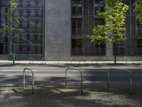 A modern architecture in the bustling city of Berlin, Germany. Yellow lines mark the asphalt road surface, with trees and vegetation providing a natural backdrop. The vibrant city life is captured in this snapshot of a busy business district.