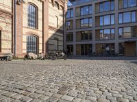 An empty street in Berlin, Germany, lined with buildings featuring classic brick walls. Bicycles parked in the middle add a touch of urban life. A perfect day to explore the city's architecture.