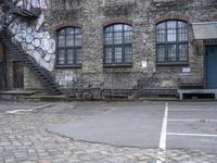 A classic architecture building in Berlin, Germany, with a brickwork surface and graffiti walls. The urban design of the neighborhood includes cobblestone roads and courtyards. The open spaces and loading docks add an industrial touch to the city. A vibrant art district in Europe.