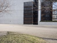 Modern architecture in Berlin, Germany. The city's concrete and iron buildings create a stark and industrial atmosphere. Clear skies cast shadows on the clean lines and textured surfaces. A true representation of European urban living.