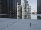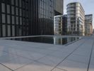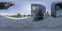 A clear sky over the modern architecture of Duesseldorf, Germany. A large building complex stands on the corner of an empty street, with a circular pool of water and a fountain in front. A perfect mix of urban design and open space.