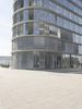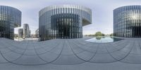 large modern building buildings on the corner of an empty street with a circular pool of water and a fountain in front
