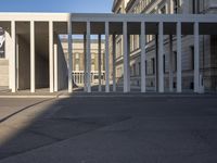 the large, empty sidewalk with multiple columns in front of the building with two signs
