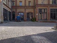 A classic architecture building in Berlin's business district. The cobblestone road and brickwork create a charming urban atmosphere. Open spaces and straight roads lead to art districts and office buildings. Sunlight creates striking shadows on the building's big windows.