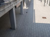 A modern architecture in Berlin, Germany. The high-rise office building stands tall in the city's business district. Clear skies and open spaces surround the concrete bridge and walkway, creating an elevated and modern urban landscape.