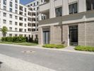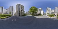 A modern residential area in Berlin, Germany. The straight road leads to a row of apartment buildings, surrounded by trees. The clear sky and hard shadows create a striking cityscape. A perfect example of urban design in Europe.