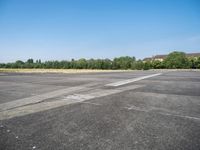 A clear sky over Berlin, Germany. The urban landscape features asphalt roads and parking lots, surrounded by green grass and trees. The city's open spaces and thoroughfares showcase its urban design.