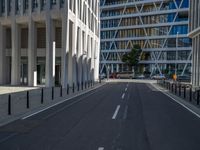 Modern urban design in Berlin's business district. Office buildings cast hard shadows on the asphalt road. European architecture under clear skies defines city life in Germany's capital.