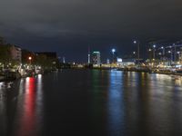 A stunning night view of Berlin, Germany. The modern architecture of the city is illuminated by the lights from high-rise buildings, street lights, and artificial light. The cityscape reflects on the calm waters of the lake, creating a magical atmosphere.