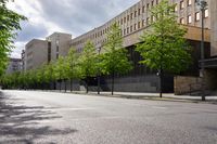 empty city street with tall buildings on either side of it and trees lined on both sides