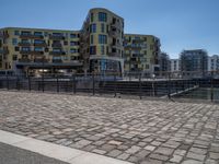 A modern and vibrant cityscape in Germany, with clear skies and a stunning coastal view. The road lined with cobblestones leads to a picturesque pier and harbor. Urban design and modern architecture create a unique atmosphere.