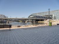 This image showcases the city of Berlin, Germany with its modern architecture and urban design. The cityscape is reflected in the water of the lake, creating a beautiful scene. The clear sky above highlights the architectural details of the buildings and bridges. The cobblestone roads and asphalt surfaces add to the urban atmosphere. The vegetation along the road and the pier create a pleasant contrast against the city's architecture. This photo captures the vibrant city life and cultural heritage of Berlin, making it a perfect representation of Europe's unique charm.