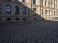 Cobblestone street in Berlin, Germany. Classic architecture buildings line the road, casting hard shadows and creating a picturesque scene. An empty open space provides a glimpse into the city's industrial past.