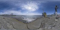 a panoramic view shows an old building and the ocean while people walk along a cobble stone street next to it